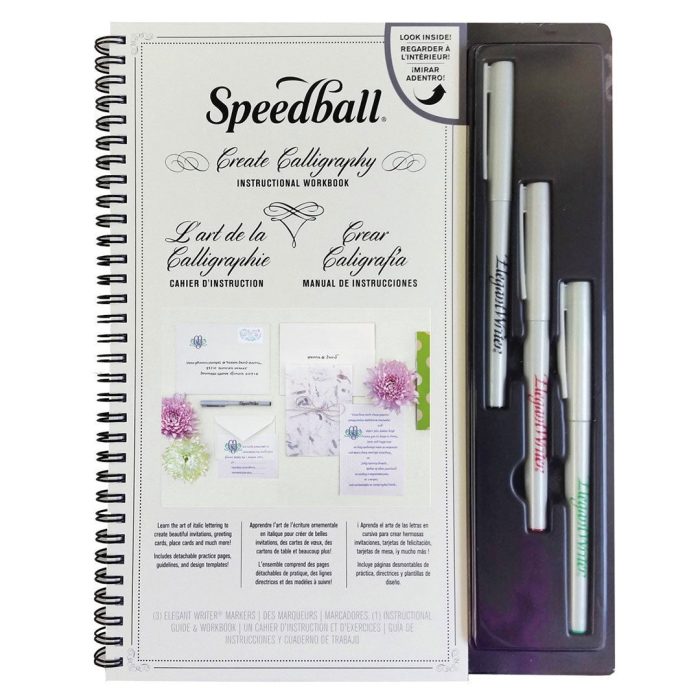 This Speedball Lettershop Calligraphy kit includes the Create Calligraphy Instructional Workbook – ideal for beginners and students interesting in learning calligraphic writing. It also includes 3x Elegant Writer Markers in black (2.0mm), green (1.5mm) and red (3.0mm).